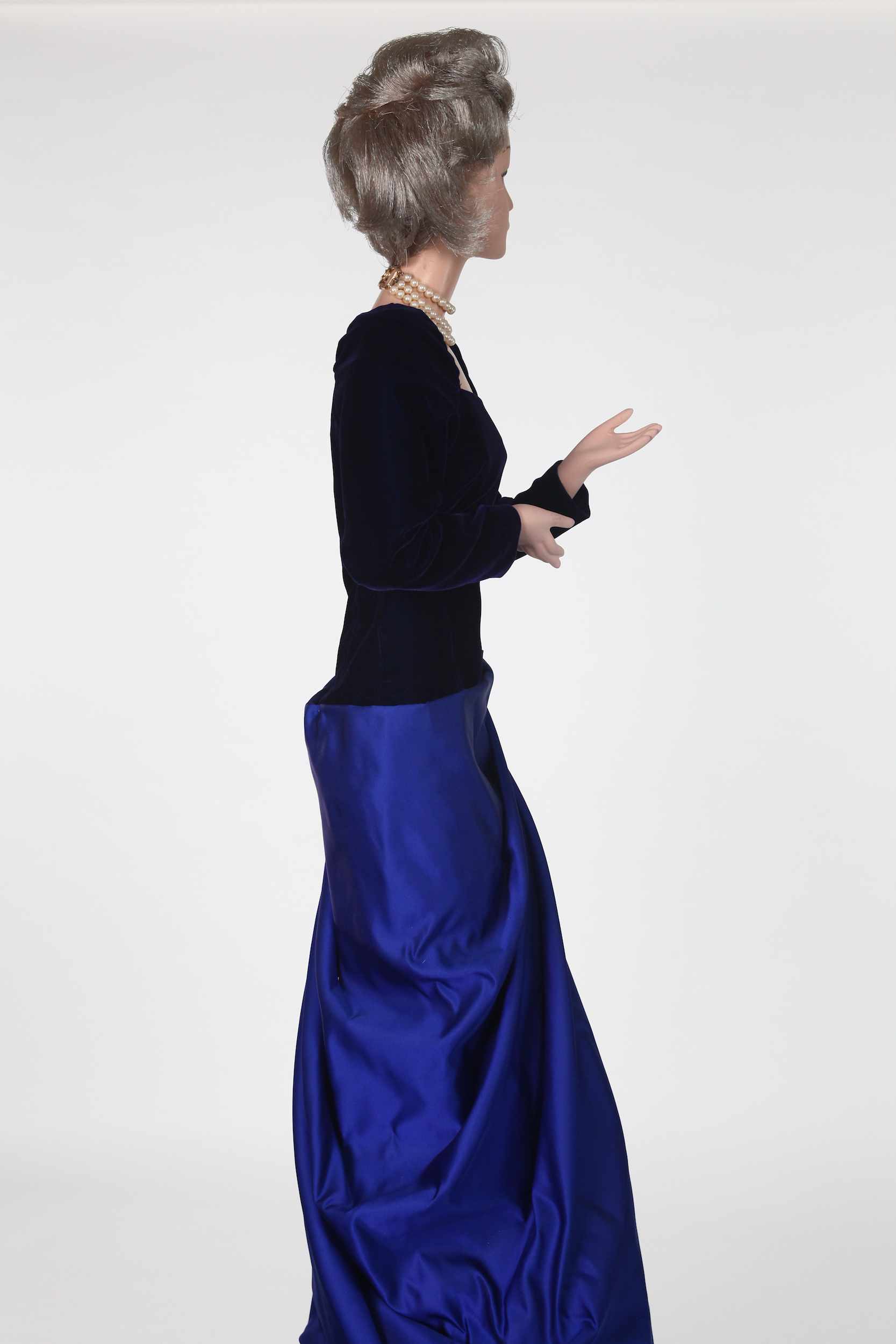 ● Served: 1989-1993 ● Designed by Arnold Scaasi of Canada ● The royal blue asymmetrical dress is one of a handful of similar dresses, and when Mrs. Bush chose it, the designer discontinued the style. Back to First Ladies’ Museum